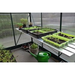De constructie bestaat uit aluminium leggers (6 stuks), dragers en schoren (6 stuks). Een solide verbinding met het kasframe wordt gemaakt met behulp van RVS (hamerkop)bouten en moeren, standaardmaat M6. De kweektafel is in hoogte verstelbaar en kan op een ideale werkhoogte worden ingesteld.