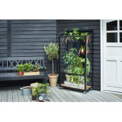 De Juliana City Garden is een moderne verrijdbare muurkas/patiokas voor op het (dak)terras, balkon of de veranda. Deze zwart gecoate kas heeft een glazen achterwand waardoor de kas op alle plaatsen licht opvangt. De City Garden heeft één dakraam voor het beheersen van de temperatuur en wordt geleverd inclusief 4 zwenkwielen waarvan 2 met rem om de kas vast te zetten.