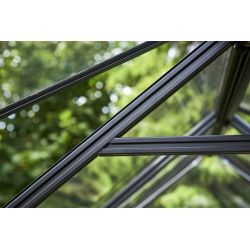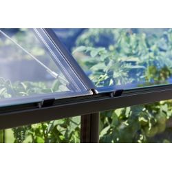 De schuifdeur met handgreep is 180 cm hoog en voorzien van een telescopische deurrail. De drempel is zeer laag waardoor de kas goed toegankelijk is met o.a. een kruiwagen. De Qube 68 is standaard voorzien van een zwarte coating en de nokbalk, goten en fundering (apart te bestellen) worden geleverd in 2 delen.