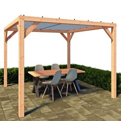 Pergola Silvano is een moderne pergola gemaakt van douglashout met zonweringdoek. De pergola is 256 cm hoog en 324 cm breed en diep. De pergola heeft een stevige basis dankzij de halfhoutse hoekverbindingen en schoren. De robuuste staanders van 12 x 12 cm geven de pergola een stoer karakter.